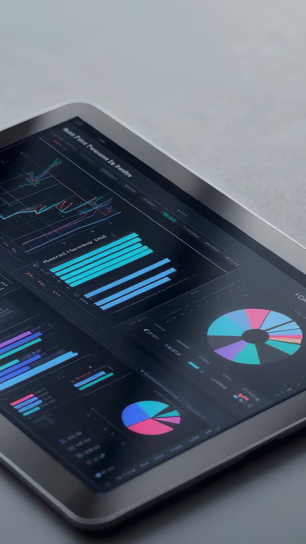 AI Generated Video. Vertical video showing sliding camera revealing tablet on gray desk, highlighting interactive dashboard with multiple charts and colorful data visualizations under soft glare. Screen showing line graphs, stacked bar charts, donut and pie charts with teal, blue, purple, and pink accents. Camera panning slowly across display while light reflection creating cinematic sheen. Footage suiting business presentations, app demos, fintech promos, investor pitches, and social media vertical ads. Footage working well for illustrating analytics concepts, performance tracking, KPI reporting, dashboard UI, data storytelling, and technology branding. Clip fitting for website hero, mobile ad campaign, tutorial intro, product launch clip, corporate training module, and marketing reel. Color palette and modern interface helping convey innovation, professionalism, and data driven decision making. File offering clean composition, shallow depth of field, and smooth motion for easy editing into short form content.