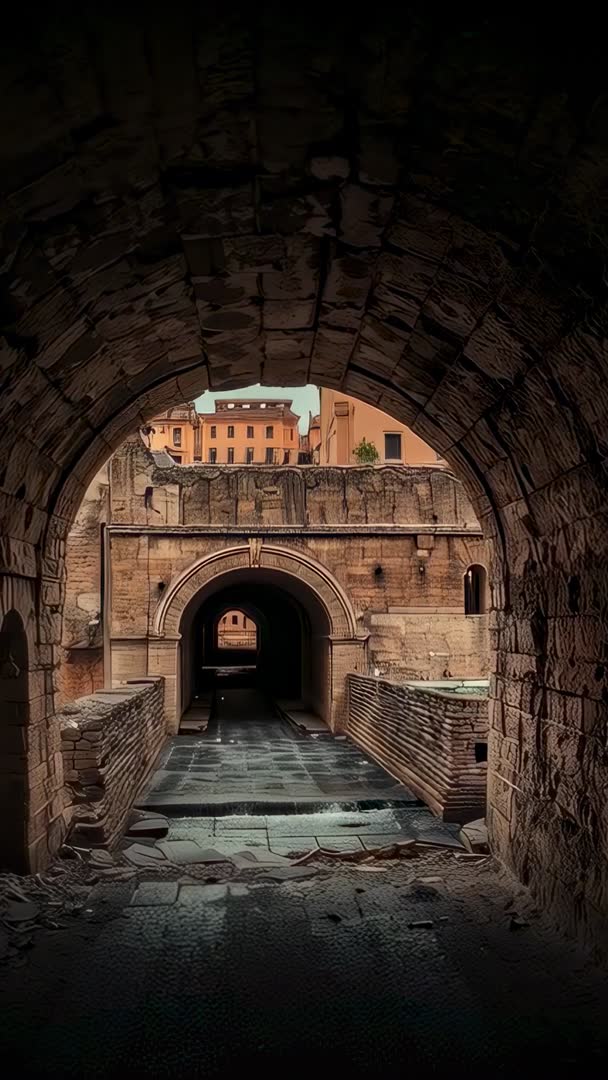 AI Generated Video. Vertical clip showing camera sliding through ancient stone archway, revealing sunlit courtyard and wet flagstones reflecting pale sky. Passage is framed by weathered masonry and layered arches, creating strong depth and cinematic lead-in. Lighting is moody with warm tones on distant buildings and cool shadows in foreground. Use for travel promos, history documentaries, architecture features, heritage tourism ads, and social media reels. Work as establishing shot, video opener, transition plate, or background for title sequences and voiceover. Recommend adding ambient sound design (echoing footsteps, dripping water) and gentle camera-stabilized motion for immersive feel. Suitable for portrait-first platforms, mobile ads, museum displays, and editorial pieces about urban archaeology and restoration.