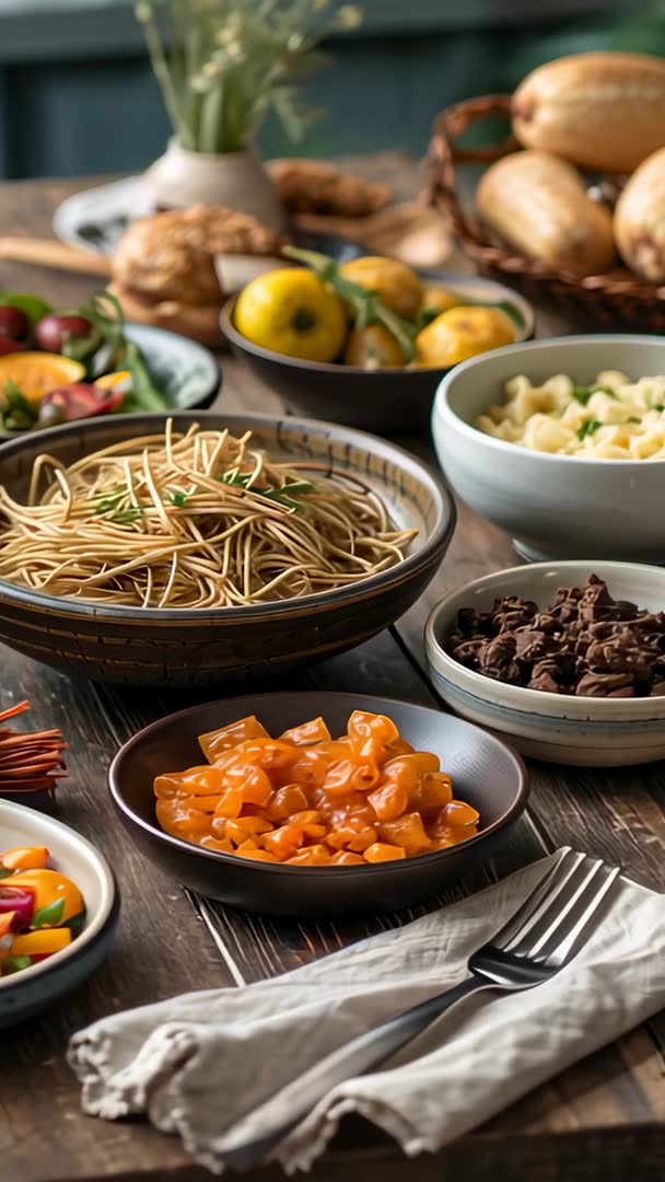 AI Generated Video. Sliding camera revealing noodle bowl on rustic wooden table, showcasing citrus fruit, crusty bread, ceramic bowls, and colorful side salads. Warm natural light highlighting textures on pasta and wooden table surface. Perfect for food blogs, recipe videos, restaurant promos, cooking class intros, and social media reels. Useful for showcasing seasonal menus, farm-to-table concepts, family-style dining, and catering presentations. Editing tips: crop for vertical platforms, add gentle pan music, overlay recipe text or ingredient list, and use warm color grade to enhance mood. Production ideas: pair with voiceover recipe instructions, add ingredient close-ups, include slow-motion pour or toss shots for visual interest. Licensing suggestions: stock footage for commercial campaigns, menu videos, seasonal promotions, and editorial food stories.