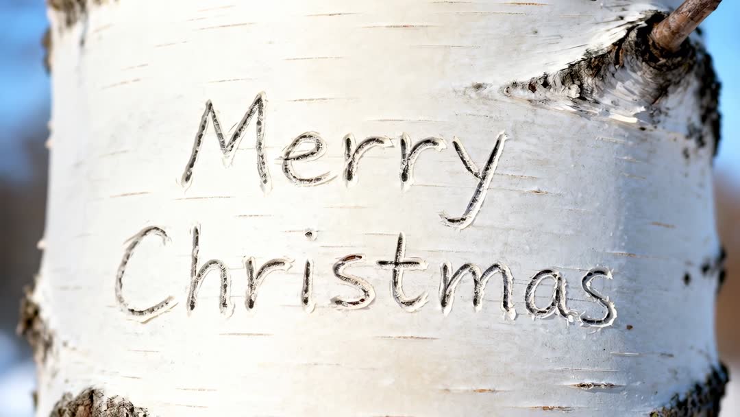 - Slow camera moving closer revealing carved Merry Christmas on birch trunk in winter closeup