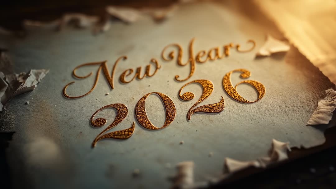AI Generated Video. Featuring gilded embossed numerals and flowing script lettering on aged parchment with torn edges and floating dust particles. Showing slow camera push and focus pull under warm golden rim light for cinematic mood and elegant shimmer. Suited for New Year countdown intros, holiday marketing, luxury branding, event invitations, social media reels and website hero loops. Allowing easy placement of logo and lower-third text within darker margins for branded messages. Providing 4K-ready composition with shallow depth of field, smooth motion and seamless looping potential. Suggesting color grade toward warm tones, gentle vignette and subtle film grain for vintage luxury atmosphere.