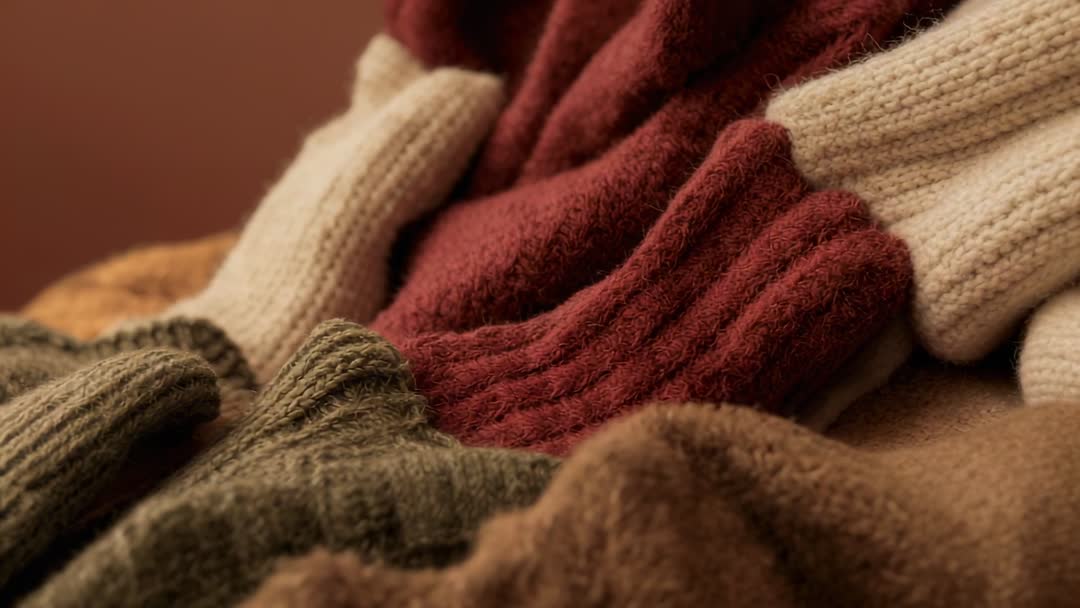 - Slow camera revealing close-up of cozy knitted mittens and scarves in warm autumn tones
