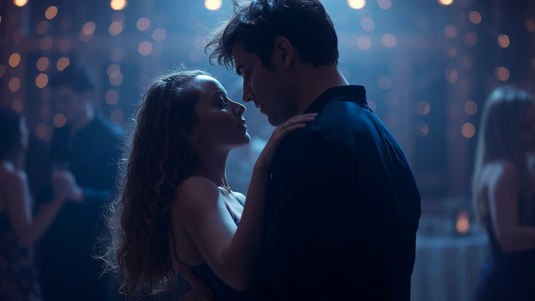 AI Generated Image. Video clip showing slow-dancing couple under string lights in dim ballroom, capturing intimate romantic embrace and tender gaze. Lighting creating soft blue mood with warm bokeh and candlelight accents, enhancing cinematic romantic tone. Shot composing close framing and shallow depth of field, focusing on connection and emotion while background couples remain softly blurred. Suiting wedding trailers, engagement announcements, dating app campaigns, romance film scenes, social media storytelling, lifestyle blogs, event promotion. Editing tips: leaving color grade in cool blue tones with subtle warm highlights, adding soft piano or acoustic track, pacing with slow crossfades for emotional impact.