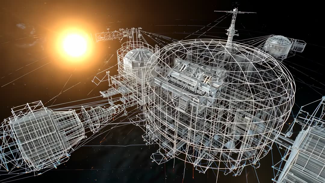 AI Generated Image. Drone camera performing slow flyby past wireframe sphere module in orbit, revealing internal structural detail and modular nodes. Wireframe rendering overlaying detailed mechanical components, trusses, docking ports and habitation bays. Sunlight producing strong lens flare and rim lighting across metal framework. Serving technology presentations, engineering demonstrations, sci-fi trailers and architectural visualizations. Serving as background for website hero banners, title sequences for documentaries on space habitats, corporate R&D slides, educational videos on orbital construction and marketing for aerospace startups. High contrast wireframe over dark starfield, dynamic camera movement and close-up reveals of structural complexity. Editable for color grading, speed ramp, HUD overlays and compositing into larger animation. Ideal for editorial and commercial projects, online campaigns and broadcast.