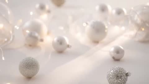 AI Generated Video. Video showing slow focus pull across tabletop, revealing textured silver bauble in foreground and creating warm fairy light bokeh in background. Shot featuring shallow depth of field, soft neutral tones, and reflective metallic highlights, suiting holiday and seasonal productions. Use for title screens, social media ads, website hero banners, greeting card promos, broadcast idents, or product overlays. Composition leaving generous copy space for text, logo, or lower-third graphics, enabling easy branding and messaging. Color palette pairing well with white, cream, pastel, and metallic brand themes. Short looping clip working for retail displays, online storefronts, event presentations, and festive montages. Serving licensing needs for seasonal campaigns, e-commerce holiday sales, lifestyle branding, and motion design templates.