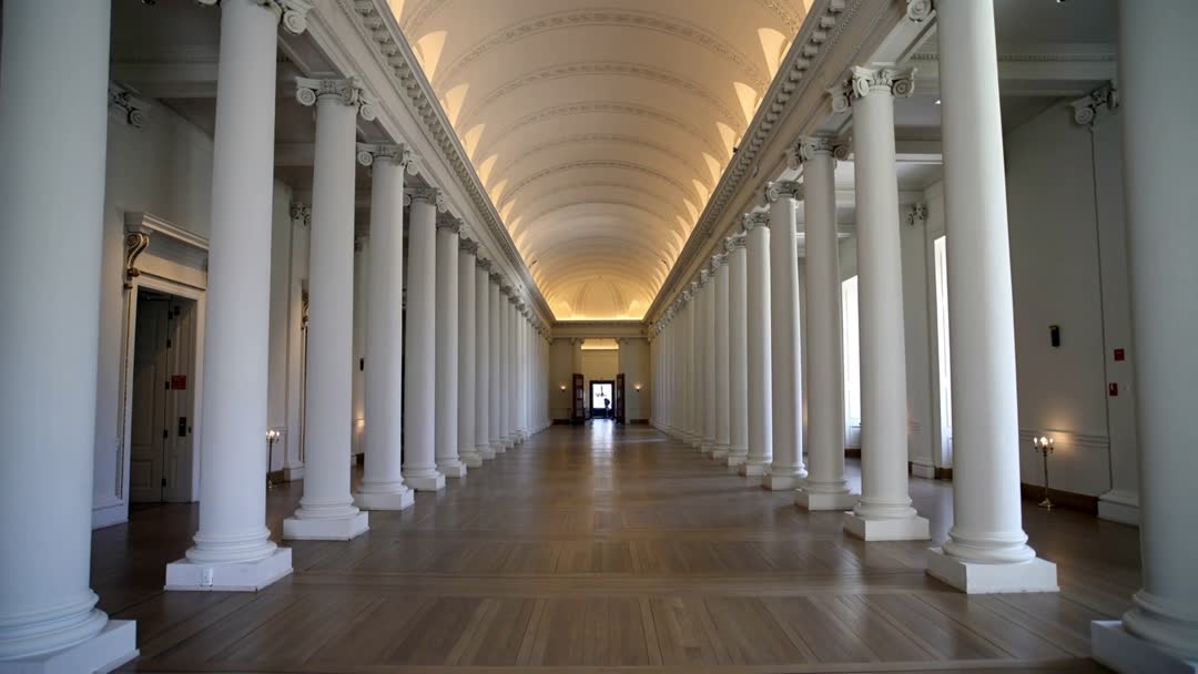 Slow forward tracking through neoclassical colonnade toward glowing doorway Video