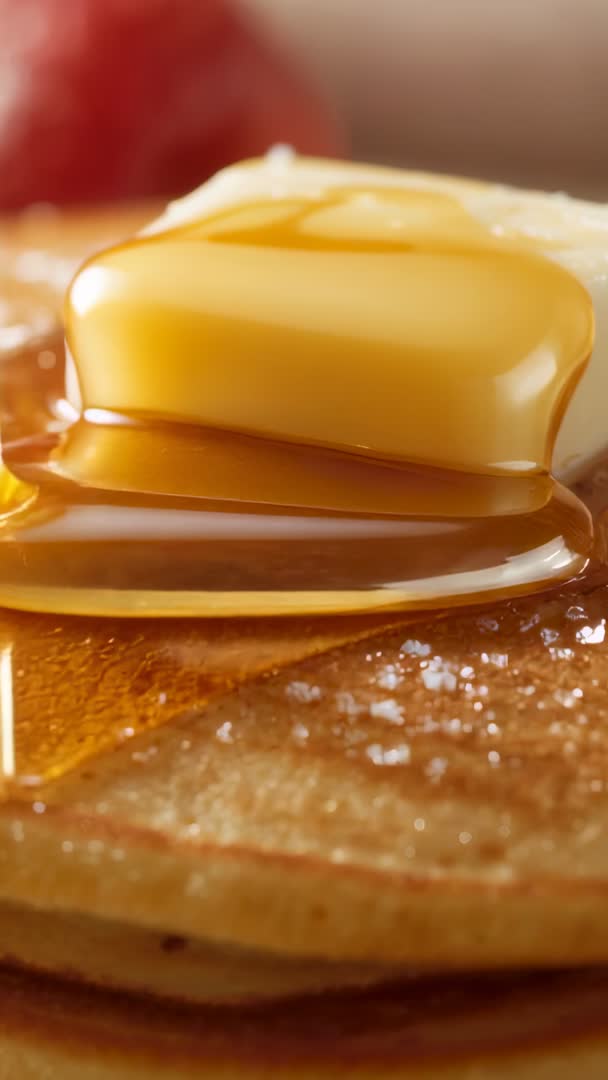 - Slow-Motion Amber Syrup Pouring Over Butter Pat on Pancakes Vertical Macro Breakfast Video