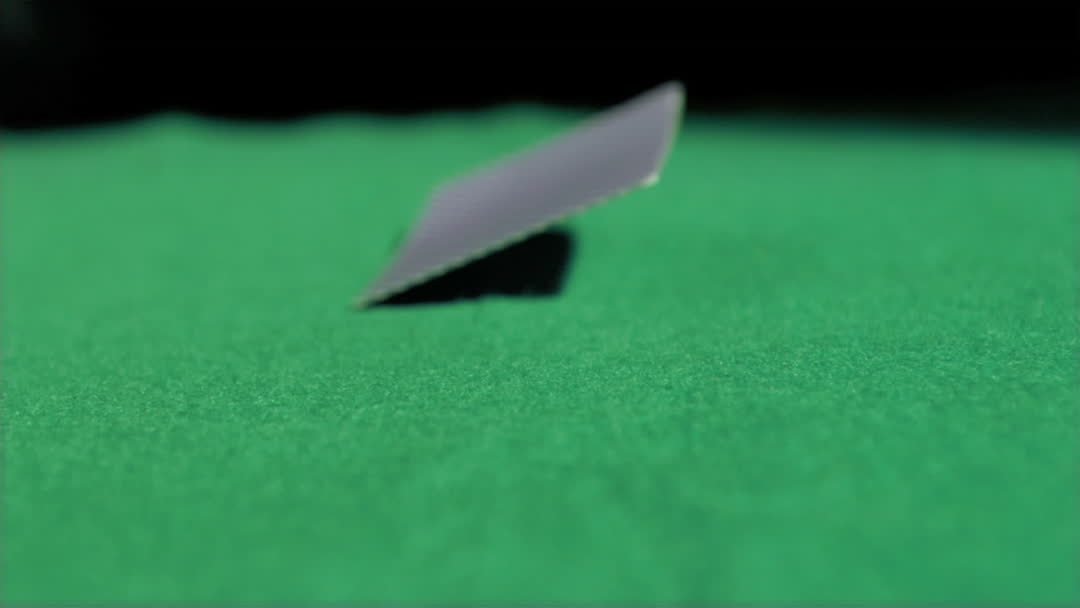 The scene captures a card coming to rest in slow motion on a poker table’s green felt. The motion showcases precise throwing mechanics often seen in gambling games. Perfect for use in contexts relating to poker skills, casino environments, or slow motion cinematography effects.
