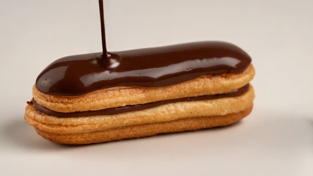 AI Generated Image. Showing slow-motion close-up of glossy chocolate glaze pouring over eclair, highlighting drip formation and mirror-like reflections on surface. Capturing layered choux pastry with rich chocolate filling and crisp golden texture. Neutral pale background keeping focus on pastry and glaze and providing ample copy space for logo, headline, or call-to-action. Ideal for bakery marketing, recipe videos, menu design, social media ads, television commercials, and packaging. Suggesting use as looping clip for Instagram reels, freeze-frame for hero shot, slow-motion reveal in cooking tutorials, or cropped macro for banner graphics. Providing high-resolution detail for culinary magazines, food blogs, and product catalogs; recommending slight color boost and soft vignette to enhance glossy highlights and texture.