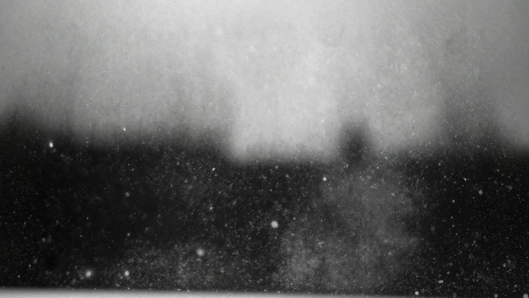 - Slow-motion dust particles drifting across window forming central plume over dark horizon