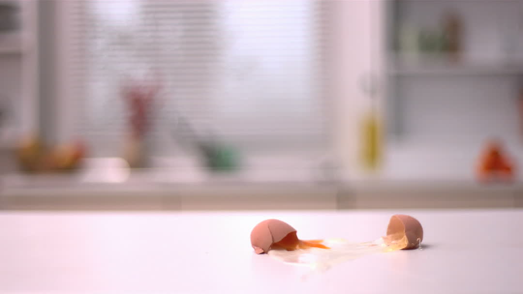- Slow Motion Egg Breaking on Kitchen Counter for Culinary Concepts
