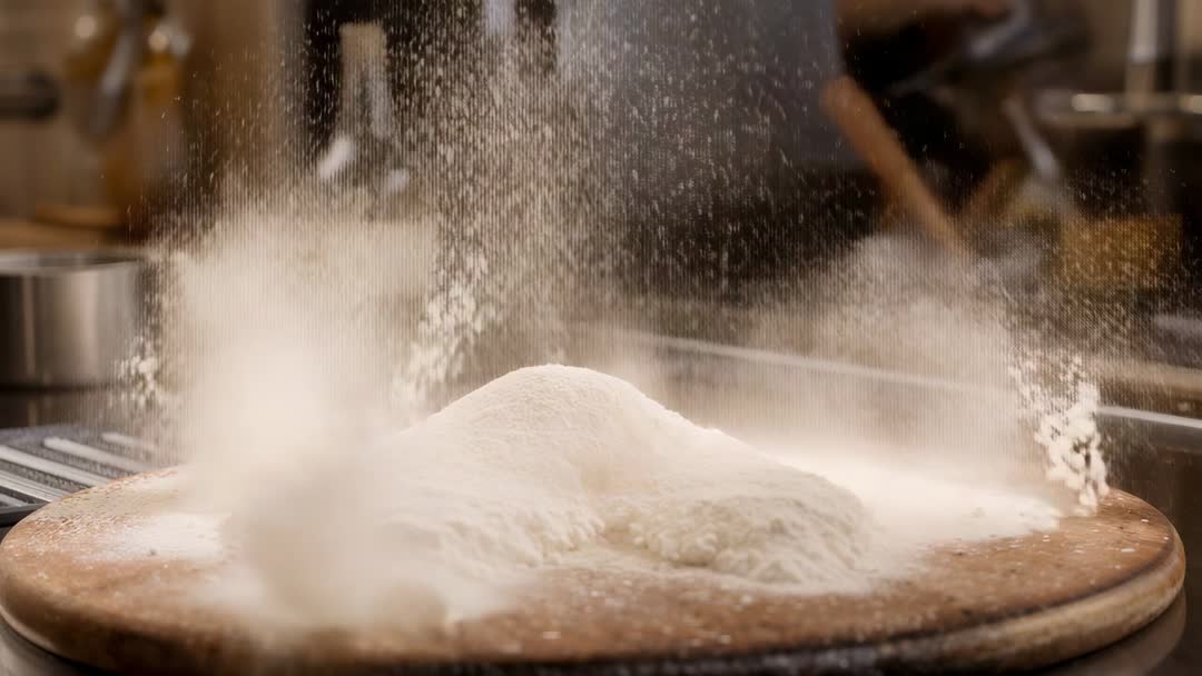 AI Generated Video. Video showing slow-motion bursting of flour cascading and collapsing on round wooden board over stovetop. Closeup capturing powder cloud, fine grain texture, motion blur, warm kitchen lighting and natural wood tones. Useful for illustrating baking process, ingredient handling, messy cooking action, texture backgrounds and sensory food content. Use for food blogs, recipe videos, cooking classes, bakery commercials, flour packaging, kitchen tool ads, hero website banners, social media reels and culinary presentations. Editing ideas include looping slow-motion segments, isolating powder cloud for overlays, adding text callouts for product promotion, and cropping for square or vertical formats for mobile. Recommended final touches include gentle color grade to enhance warm browns and subtle sound design of falling flour for immersive effect.