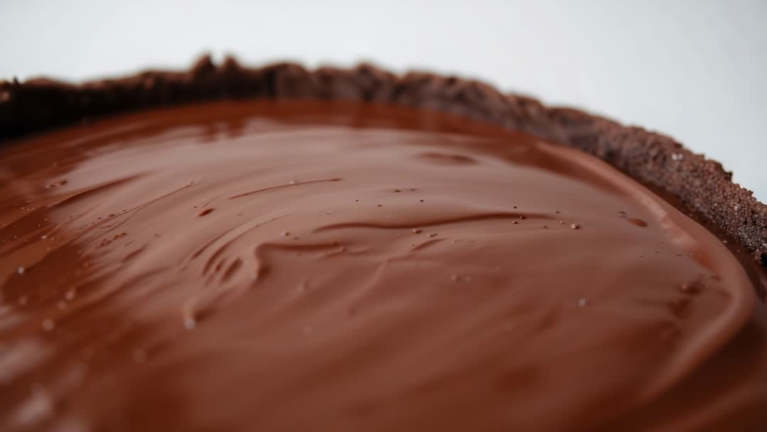 - Slow-motion ganache rippling and settling on round chocolate tart with chocolate crumb crust