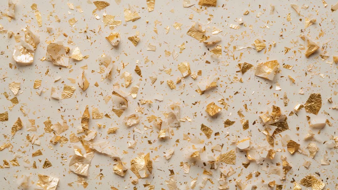AI Generated Image. Macro slow-motion video showing gold foil flakes drifting across warm beige surface and catching angled light to create shimmering highlights. Working well for luxury branding, product reveal, event opener, website hero header, and social media loops. Providing elegant animated background for title overlays, lower thirds, and logo reveals. Suggesting pairing with minimalist typography, soft ambient audio, and subtle camera drift or slow zoom to enhance depth. Offering easy loop and color grading to match brand palette. Also useful for packaging mockups, editorial motion pieces, desktop wallpaper, and decorative texture overlays.