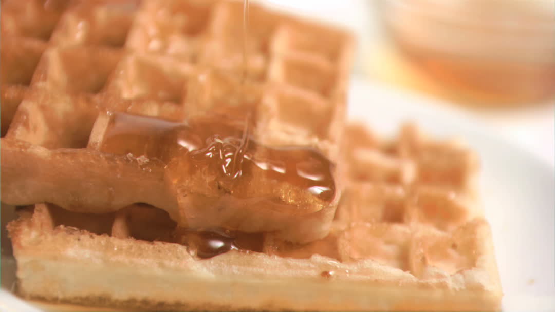 - Slow Motion Honey Drizzling Over Crispy Waffles