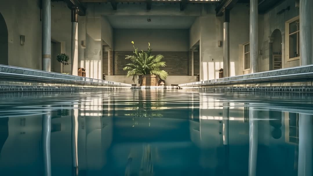 AI Generated Image. Video showing slow-motion ripples across indoor pool surface, reflecting potted palm and classical columns. Light from skylight forming grid of highlights on water, creating layered reflections and soft contrast. Symmetrical composition centering palm at far end, archways and tiled pool edges framing scene. Color palette featuring muted greens and warm neutrals, mood calm and meditative. Use for luxury spa promotion, hotel marketing, wellness videos, meditation app backgrounds, architectural showcases, cinematic intros, corporate wellness presentations, interior design portfolios, travel brochure hero banners, social media ads, lobby AV loops. Clip working well for looping background or slow-motion cutaway. Color grading toward warmer tones recommended to enhance inviting mood. Adding soft ambient soundtrack and subtle water sound design enhancing immersive feel. Overlaying minimal text on upper third or left side preserving central symmetry. Exporting in 4K for hero banners and in 1080p for web use. Ideal duration 6-12 seconds for seamless loop; extending via crossfade for longer sequences.