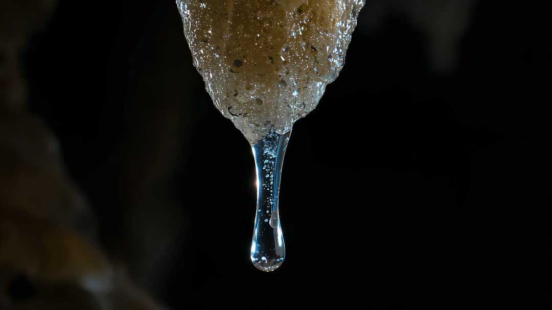 - Slow-motion macro video of droplet dripping from cave mineral tip, filament and bubbles