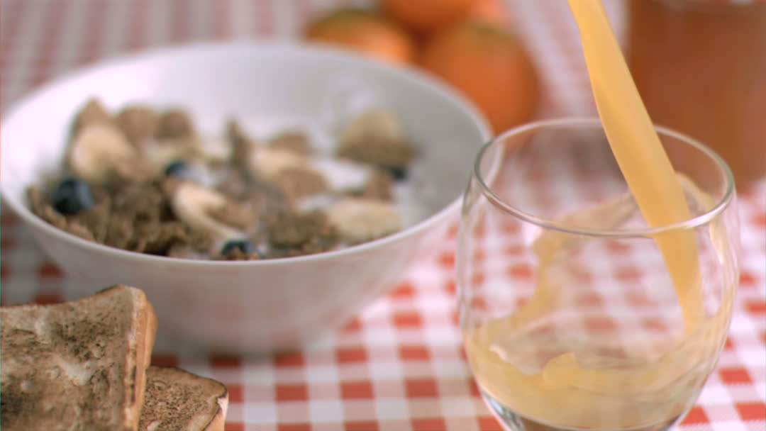- Slow Motion Pouring Orange Juice Into Glass with Breakfast