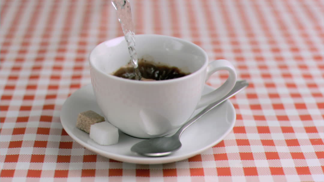 - Slow Motion Pouring Water into Instant Coffee Cup on Tablecloth
