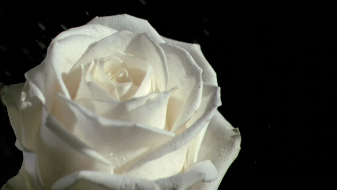 - Slow Motion Rain on Elegant White Rose with Black Background