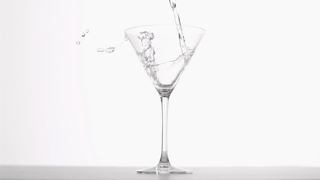 Striking video of a martini splashing in a classic cocktail glass, captured in stunning slow motion. The clear liquid contrasts with the clean white background, creating an elegant and sophisticated scene. Ideal for use in beverage packaging design, bar or restaurant advertisements, and cocktail recipe illustrations.