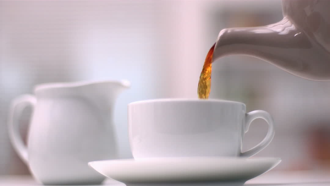 - Slow Motion Tea Pouring Into White Cup