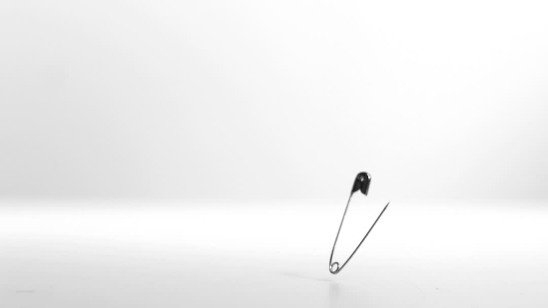 The video captures a minimalist scene of a metal safety pin vibrating after a fall, set against a clean white background. This scene is perfect for editorial content related to safety, sewing, or craftsmanship themes. It can also be used in design projects that use simple, striking videory.