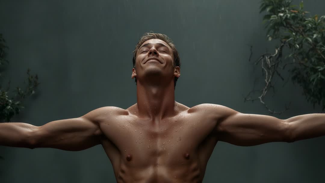 AI Generated Video. Portraying barechested male with arms out, head tilted back, and water droplets falling over muscular torso. Showing slow-motion raindrops, controlled lighting, muted backdrop, and serene facial expression conveying relaxation and renewal. Suiting fitness, wellness, spa, massage, mental health, lifestyle, fashion, grooming, body care, hydration campaigns. Working well as hero video for websites, social media ads, promotional reels, commercial spots, or background footage for meditation and breathing guides. Allowing slow-motion or loop editing, color grading for mood enhancement, and overlaying text or logos on negative space. Providing cinematic, emotive footage for brand storytelling, fitness programs, spa promotions, or editorial features.