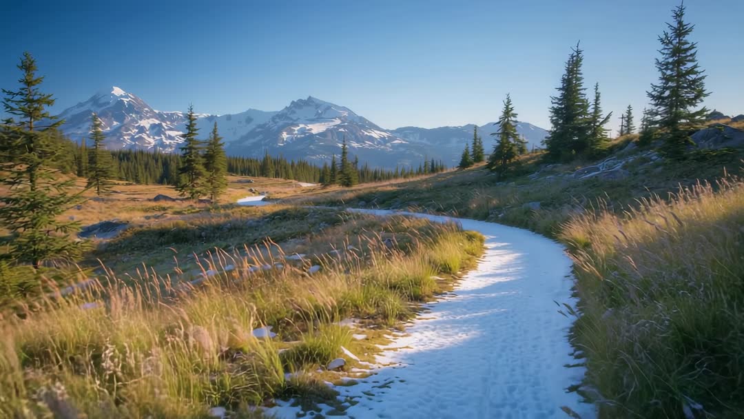 - Slow-moving Trail Through Frosted Alpine Meadow Revealing Snow-Capped Peaks and Conifers