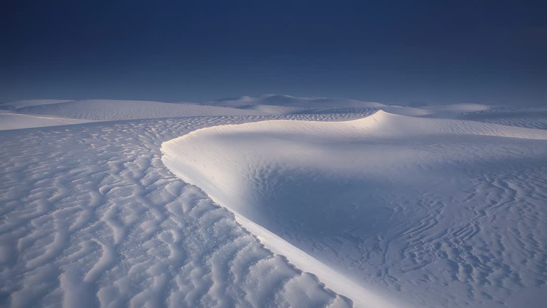 AI Generated Video. Slow camera pan across pristine white sand dunes at twilight, revealing curved ridge and intricate rippling textures shaped by wind. Cool blue tones and soft side light creating strong contrast between smooth slopes and textured foreground. Minimal composition emphasizing vast empty landscape and flowing lines, evoking calm and isolation. Ideal for nature documentaries, travel promos, meditation and wellness apps, website hero banners, corporate backgrounds, and broadcast packages. Clip working well as looping background with gentle ambient soundtrack, or as establishing shot for desert, adventure, or solitude themes. Suggested post-production options including subtle color grading to cool or warm tones, slow crossfades, and gradual dolly or zoom to enhance cinematic mood. Provided in 4K and widescreen crops, compatible with slow motion and time-lapse sequences, and suitable for social media loops, title plates, and ambient video installations.