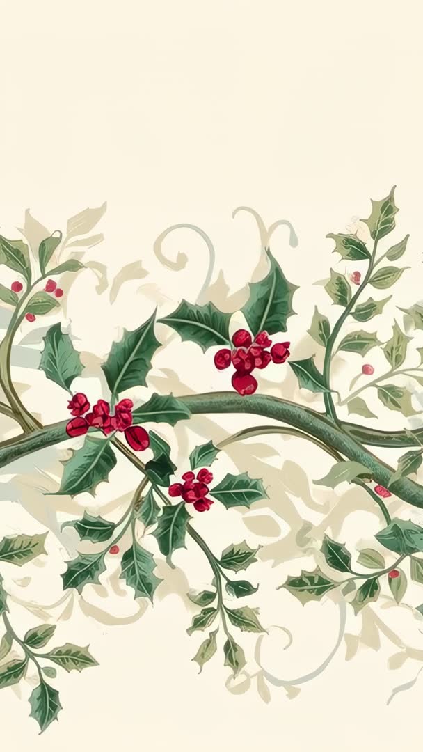 AI Generated Video. Slow camera panning along holly vine across cream paper background, centering on clusters of red berries. Handpainted watercolor illustration style featuring decorative swirls and vintage botanical mood. Working well for holiday greeting cards, stationery headers, social media vertical reels, website hero banners, seasonal packaging, and festive invitations. Allowing smooth looping for Instagram Stories and TikTok vertical ads. Offering rich green and deep red color palette against soft neutral backdrop, creating elegant seasonal atmosphere. Leaving ample negative space in upper frame for overlay text, logo, or animated title.