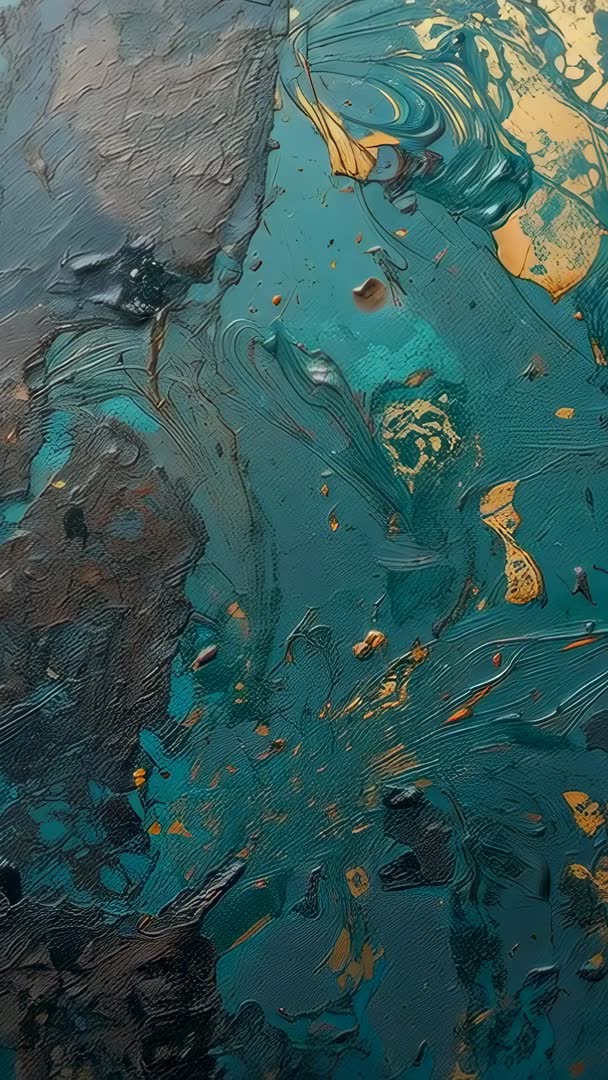 AI Generated Video. Slow panning vertical video revealing rich teal and metallic gold impasto canvas, emphasizing thick paletteknife texture and expressive brushwork. Close-up motion capturing tactile surface, paint ridges, gold flecks catching light, subtle shadowing and layered color. Serving as elegant background for social media reels, Instagram stories, vertical ads, gallery promo reels, and art documentary sequences. Offering crop-free vertical composition and smooth slow pan ideal for looping, title overlay, and motion graphic transitions. Enhancing product presentations, luxury brand visuals, interior design portfolios, and creative websites seeking tactile contemporary aesthetic. Supplying high visual texture for use as texture overlay in video edits, print detail studies, mood boards, or promotional content.
