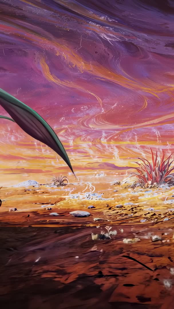 AI Generated Video. Showing slow vertical pan across vibrant desert mural inside gallery, featuring oversized green leaf foreground, textured red soil, and swirling purple-orange sky. Painterly brushstrokes and layered textures creating cinematic, abstract landscape mood. Ideal for use in art exhibition promos, interior design moodboards, gallery tour reels, vertical social media stories, and museum signage. Suggesting gentle crossfade transitions, ambient soundtrack, soft color grading, and looping 6-15 second segments for seamless playback on vertical displays. Pairing with minimalist titles and subtle motion graphics for branding, website hero sections, digital signage, and event backdrops.