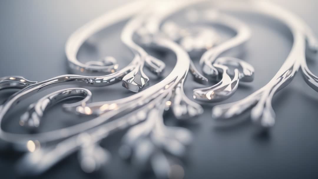 AI Generated Video. Video clip showing slow camera pull back revealing ornate silver filigree metalwork on dark matte surface. Shot using macro shallow depth of field, creating soft focus falloff and creamy bokeh highlights on reflective chrome curves. CGI metallic render offering crisp highlights, subtle reflections, and tactile embossed detail. Serving as luxury branding element, supporting jewelry and watch reveals, enhancing product packaging motion, providing hero backgrounds for websites and social media, and powering broadcast openers or title sequences. Working well as loopable background, allowing overlay text and logo animations, and supporting color grade adjustments for warm or cool looks.