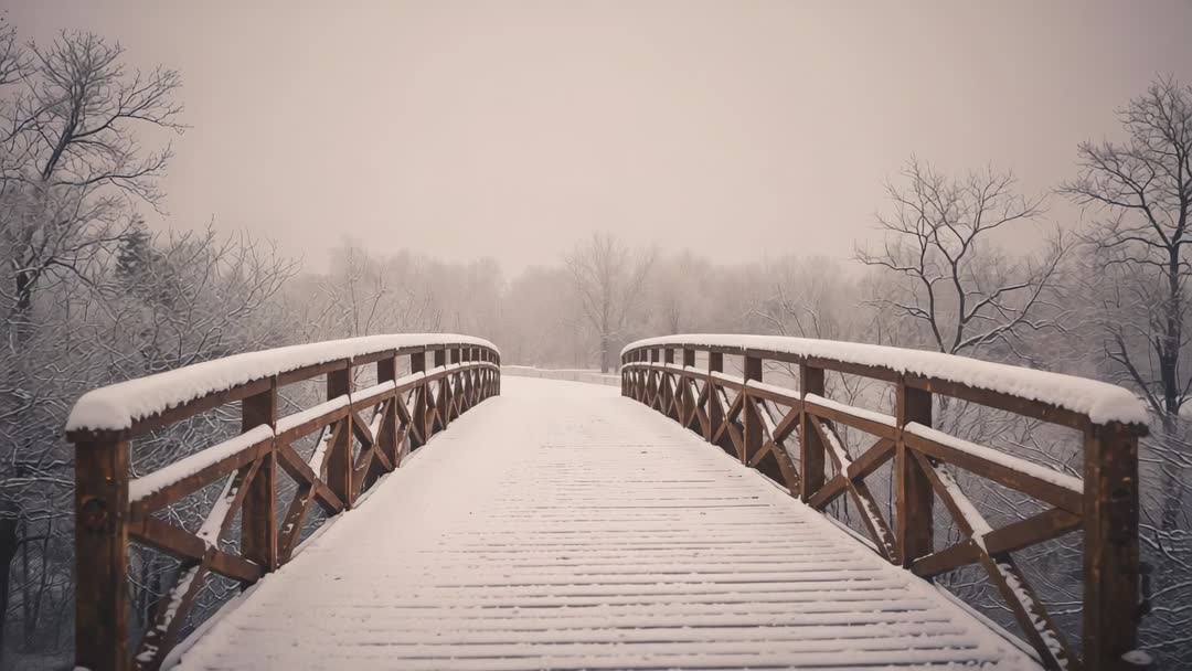 AI Generated Video. Showing slow push approach along snow-covered wooden footbridge, revealing frosted planks and crossbeam railings receding into foggy winter forest. Capturing minimalist, tranquil mood with strong leading lines and soft muted tones for cinematic feel. Offering negative space in upper frame for overlaying titles, logos, or captions and clean composition for editorial use. Ideal for winter travel promos, nature documentaries, seasonal commercials, relaxing background loops, social media reels, and wellness or meditation content. Editing suggestions: crop to 16:9 or vertical 9:16 for platform fit, apply gentle color grading toward warm or cool palette to set mood, stabilize for ultra-smooth motion, and loop seamlessly for ambient playback.