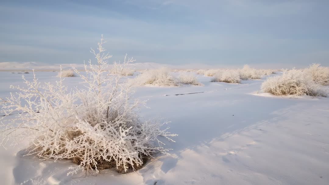 AI Generated Video. Panning right, revealing frosted shrub clusters across expansive snow plain during soft golden hour light. Providing generous copy space on right for text, titles, branding overlays, subtitles. Evoking serene, minimal winter mood suitable for nature documentaries, travel promos, holiday greeting backgrounds, wellness and meditation videos. Ideal for opening shots, slow-motion sequences, social media banners, website hero loops, broadcast lower-thirds, cinematic montages. Suggesting color grading to enhance warm highlights and cool shadows; recommending gentle stabilization and capture at 24-60fps for smooth playback. Considering seamless looping for ambient background use and adding subtle wind sound design for immersive atmosphere.