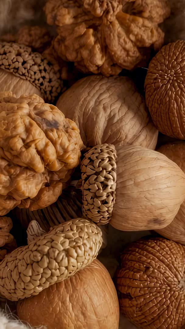 AI Generated Video. Slow vertical pan shifting down and rolling over woven bowl, revealing tight cluster of walnuts, textured seed pods, and sculptural shells. Closeup footage highlighting warm browns, deep shadows, and tactile surfaces. Vertical format optimizing mobile viewing and vertical-first platforms. Serving autumn marketing, harvest campaigns, healthy snack promotions, artisanal food packaging, and home decor catalogs. Acting as looping background for cafe menus, restaurant displays, and wellness app landing pages. Post-production tips: applying warm color grade, adding gentle ambient music, overlaying bold headline text, using slow dissolve cuts and subtle parallax for cinematic feel. Fitting macro cuts, detail inserts, product overlays, and social media reels and stories.