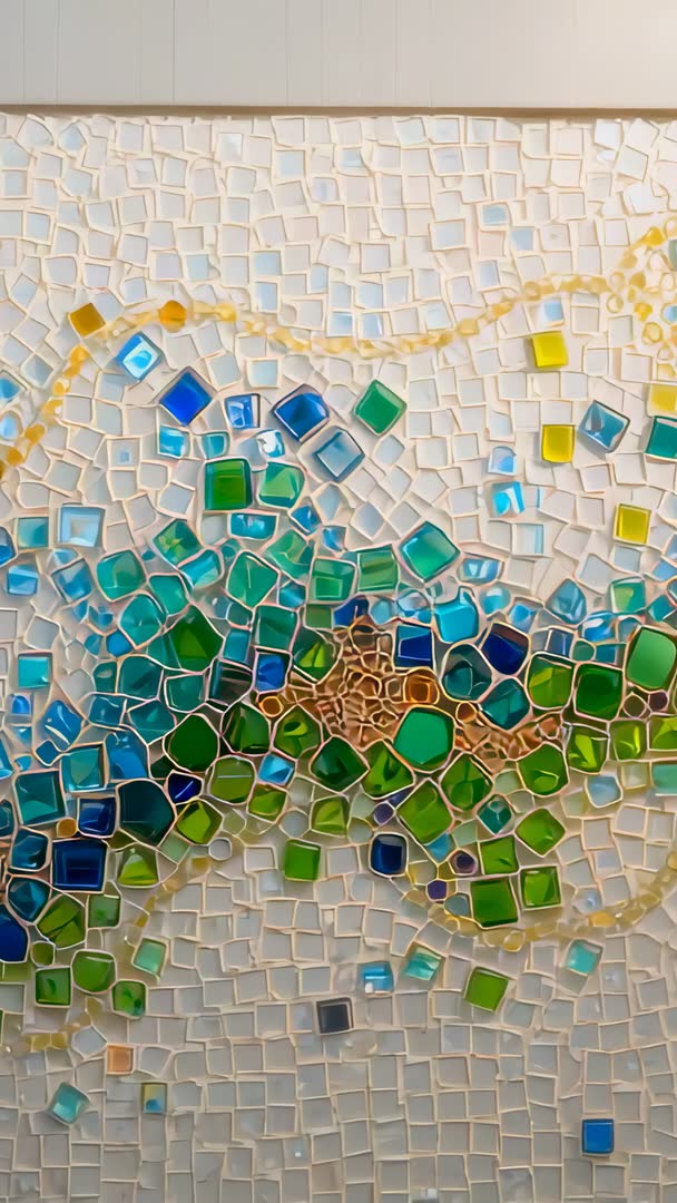 AI Generated Video. Showing slow vertical pan across colorful glass mosaic panel with shimmering gold accent line, capturing reflective blue, green and teal tiles and tessellated beads. Working well for interior design reels, architecture portfolio clips, hotel or corporate lobby promos, and art gallery walkthrough videos. Providing loopable footage for social media vertical reels, mobile stories, hero website background, and stock B-roll for editors. Highlighting texture, light play and color palette for branding, moodboards and product background for luxury or craft-focused brands. Suggesting editing choices: maintaining slow motion, applying gentle color grade enhancement, cropping for 9:16 vertical format, and looping seamless segments near gold line for continuous playback. Good for short clips (6-15 seconds) or extended slow scans for longer sequences.