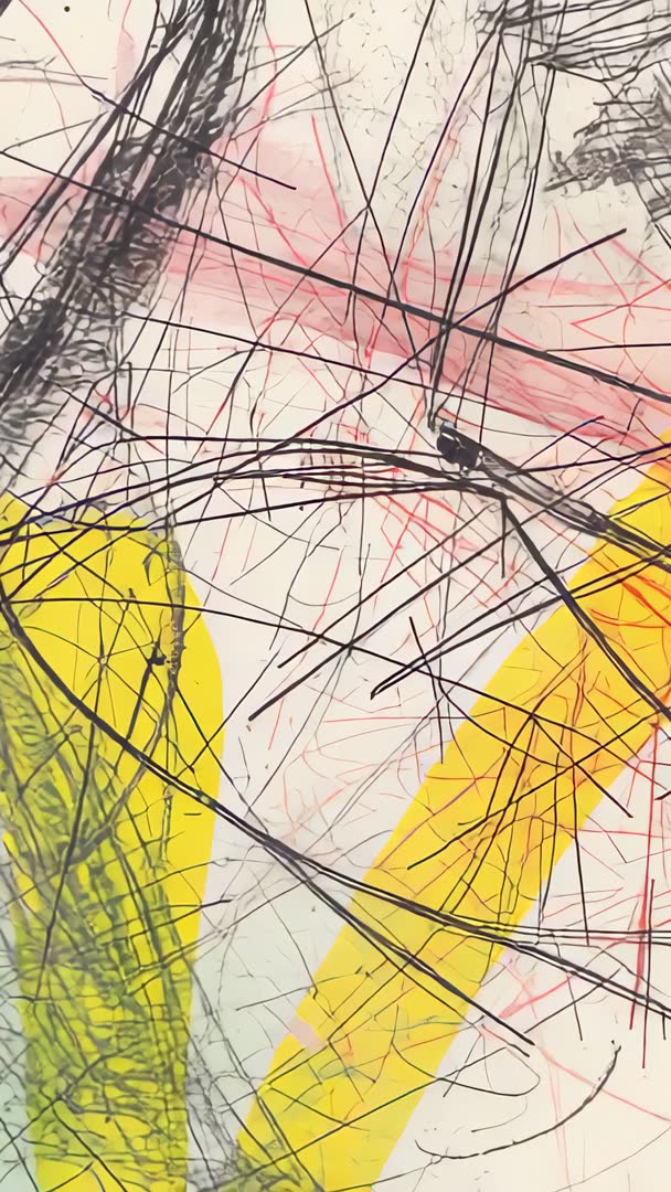 - Slow vertical video revealing abstract drawing with black scribbles, red accents, bold yellow bands