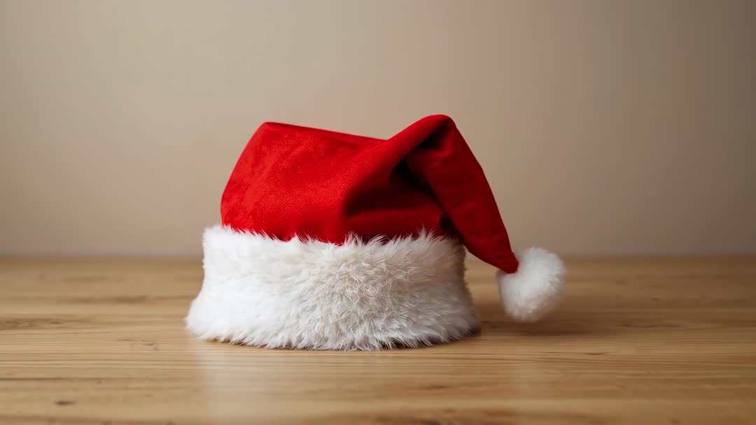 AI Generated Video. Closeup video showing slow zoom across red Santa hat with plush white fur brim resting on warm wooden tabletop. Crisp color contrast between crimson velvet and soft white fur creating cozy holiday mood. Minimal beige background allowing clean space for text or logo overlays. Footage working well as seasonal B-roll, hero clip for e-commerce, social media reel, website banner, or animated greeting card intro. Loop-friendly composition enabling smooth repeated playback for countdowns and transitions. Neutral tones supporting brand color integration and easy color grading. Ideal for Christmas campaigns, retail promotions, holiday newsletters, gift guides, and point-of-sale displays.