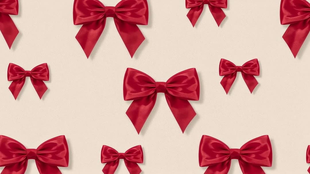 AI Generated Video. Video showing slow cinematic zoom across repeating grid of red satin bows on pale beige background, focusing on central bow and revealing rich satin sheen and soft cast shadows. Composition featuring symmetry and size variation for visual rhythm and depth. Clip offering clean negative space for text overlays, logos, and lower thirds. Ideal for holiday marketing, seasonal social media posts, e-commerce banners, greeting card animations, gift wrap tutorials, packaging mockups, website hero sections, and festive ad backgrounds. Clip working well as loopable background for countdowns, title sequences, and product reveal frames. Color palette delivering warm festive and elegant luxury mood.