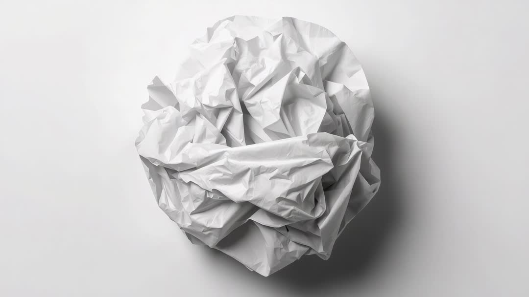 AI Generated Image. Slow zooming short video showing overhead view of crumpled white paper ball on white surface, revealing folds, creases, and soft shadow. Monochrome composition emphasizing texture, contrast, and sculptural form. Useful for representing creative block, discarded ideas, brainstorming process, or minimalist design concept. Perfect for social media clips, website headers, presentation backgrounds, editorial sequences about design or sustainability, and product promos needing clean aesthetic. Compatible with text overlay, looping background, cutaway shot in storytelling, or hero visual in motion graphics. Studio-lit look creating polished, modern feel.