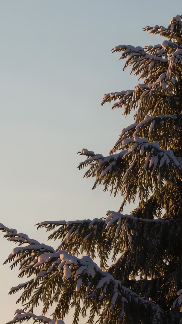 - Small bird perching on snow-covered fir branch at golden hour vertical nature video