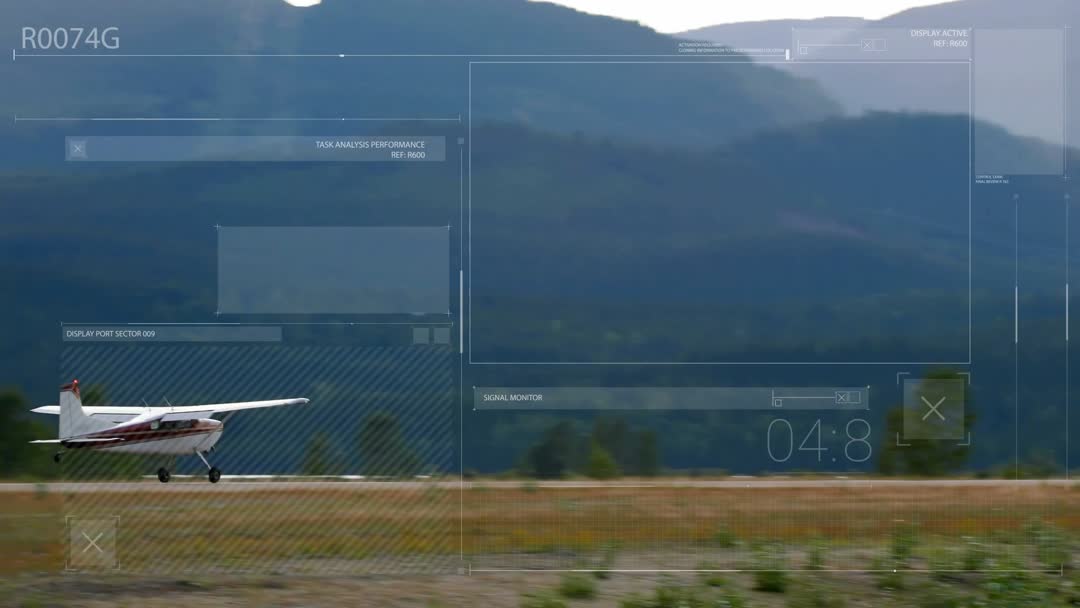 Small Propeller Plane Landing on Scenic Rural Airstrip with Futuristic Data Overlay Video