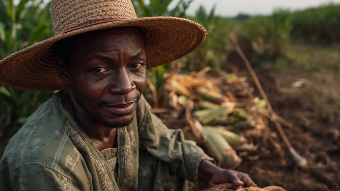 AI Generated Image. Video showing small-scale farmer resting in cornfield after harvest, adjusting burlap sack while shifting gaze toward camera. Warm late-afternoon light creating golden highlights on face and rows of dried corn husks. Tight medium shot capturing textured skin, woven straw hat, hands holding produce, soil and crop debris in background. Slow handheld or locked-off shot working well for documentary sequences, B-roll, and social impact storytelling. Suitable for agricultural marketing, rural development reports, food security features, sustainable farming campaigns, supply chain case studies, training materials for smallholder farmers, and lifestyle editorial. Color grade emphasizing warm tones enhances emotional connection. Ideal for 5-15 second cutaways or extended sequences with gentle camera push. Recommend adding ambient field sound or voiceover for narrative context.