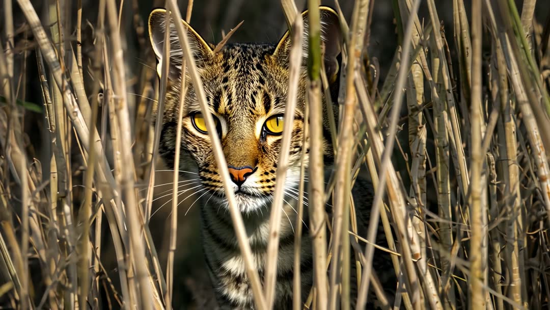 - Small wild cat stalking through reeds, peering with intense yellow eyes in sunlit marsh