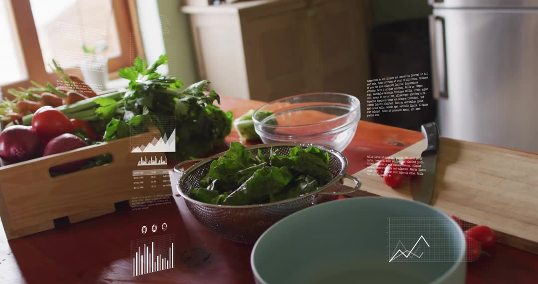 Showing fresh produce and bowls on wooden counter, animating digital charts and graphs overlaying nutrition metrics and food analytics. Combining organic lifestyle visuals with augmented reality data, communicating healthy eating choices, ingredient tracking, and smart kitchen technology. Serving health app demos, food startup pitches, wellness blogs, cooking show openers, and e-commerce video banners. Offering close-up composition for easy cropping to social media, website hero, tutorial, or investor deck. Using natural light and warm colors to create homey mood while tech overlays create modern, innovative contrast.