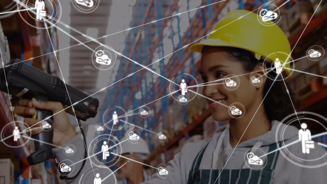 This dynamic visual represents smart logistics in a modern warehouse setting. It features a woman worker adeptly using scanning technology, symbolizing digital inventory management and global connectivity. Ideal for use in materials focused on digital transformation, automation in warehouses, or educational content about logistics and supply chain management. Emphasizes teamwork, efficiency, and innovation in business operations.
