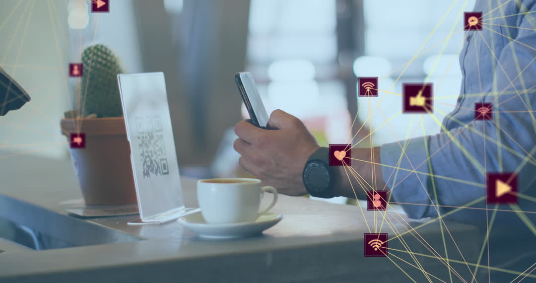 Man scanning QR code at a coffee shop using smartphone, surrounded by digital icons representing connectivity and tech integration. Ideal for illustrating themes of modern technology usage, mobile payments, smart gadgets, or digital customer experiences. Useful for articles, blogs, or presentations on digital innovations and contactless interactions in daily life.