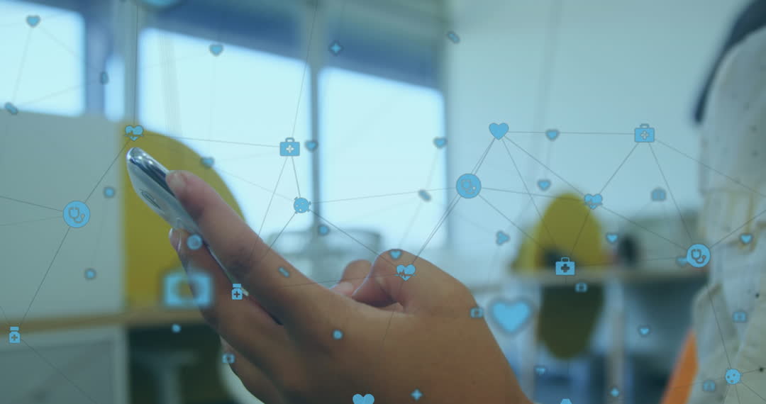 Graphic shows person using smartphone overlaid with network icons symbolizing connectivity and data exchange. Ideal for illustrating global communication, social media integration, digital innovation, and technology use in daily life. Use in articles or presentations on mobile technology and digital transformations.
